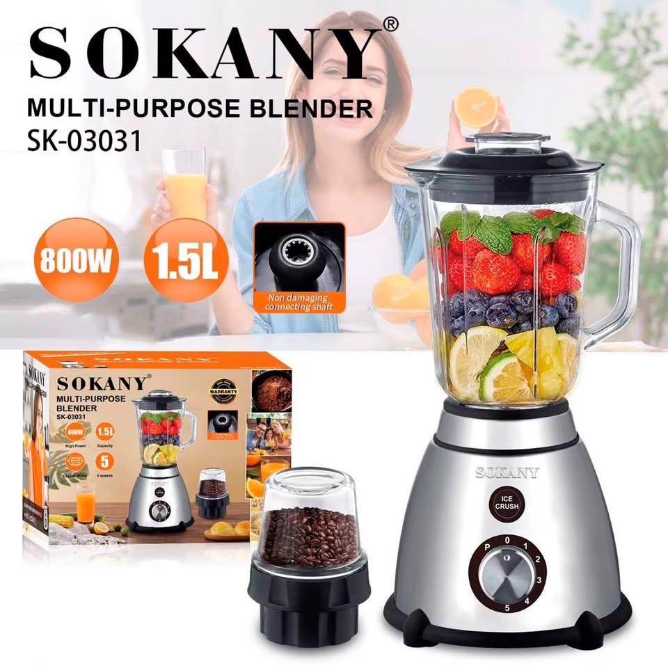 🥤 Destacadas por funcionalidad Sokany 5 en 1 Licuadora y Procesador: Muy versátil con múltiples funciones integradas (ideal para familias que preparan diferentes recetas). Licuadora y Procesador de Alimentos Sokany 3 en 1: Combinación de licuadora y procesador para triturar, mezclar y trabajar alimentos con mayor flexibilidad. Máquina Licuadora Multiusos 4 en 1 SK‑03006: Multiusos con varias funciones (licuar, picar, batir y más) ideal para preparaciones completas. Sokany Licuadora Multiusos 2 en 1 SK‑03041: Opción práctica 2 en 1 con buen equilibrio entre precio y rendimiento. 🍹 Opciones según uso Licuadora de Batidos Rápida Sokany SK‑03031: Modelo diseñado para batidos y jugos con buen rendimiento diario. Licuadora Sokany Industrial 2.5 L: Licuadora de mayor capacidad y potencia, ideal si sueles preparar grandes cantidades o recetas más exigentes. 📌 ¿Qué características suelen tener las licuadoras Sokany? ✔️ Multipropósito: Muchos modelos combinan funciones de licuadora, trituradora, picadora y procesador en un solo equipo, ahorrando espacio y tiempo. ✔️ Capacidades variadas: Desde ~1.5 L hasta ~2.5 L o más, adaptándose a tus necesidades de porción. ✔️ Cuchillas de acero inoxidable: Resistencia y eficiencia al triturar frutas, verduras y hielo. ✔️ Potencias desde 400 W hasta niveles más altos (según modelo): Control de velocidad ajustable para distintos tipos de preparación. ✔️ Diseño práctico y fácil de limpiar: Piezas desmontables y materiales aptos para uso frecuente. 🧠 Consejos para elegir la adecuada 🔹 Para uso diario y jugos/batidos: Modelos 2 en 1 o 3 en 1 con capacidad ~1.5 L y potencia media suelen ser suficientes. 🔹 Si quieres procesar alimentos además de licuar: Elige 4 en 1 o 5 en 1 que incluyan accesorios para picar o amasar. 🔹 Para familias grandes o preparaciones más intensas: Modelos con mayor capacidad (como 2.5 L) y potencia más alta ofrecen mejores resultados.